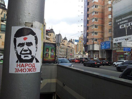 Наклейки содержат надпись ‘Народ сможет!’ и изображение Януковича с красным пятном в лбу.