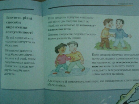 Детские книги про гомосексуализм уже в УкраинеНапомним, что такая детская литература уже существует в Европе. Как передавала ТСН, в шведском детсаде Egalia, где упразднили слова «мальчик» и «девочка» и называют детей словом, которое не указывает пол, советуют читать детям такие книжки, как история о двух самцах-жирафах, которые переживали, что не могут иметь детей, пока не нашли брошенное крокодиловое яйцо. Почти все книги в этом детском садике рассказывают об однополых парах, одиноких родителях и детях-сиротах. Исключены такие сказки, как «Белоснежка» или «Дюймовочка». Заведующая указывает, что ее задание – создать обстановку, благоприятную до гомосексуалистов, лесбиянок, бисексуалов и транссексуалов.