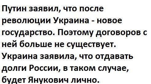 По словам президента РФ, он согласен с экспертами, которые считают, что если называть произошедшее в Украине революцией, то ‘на этой территории возникает новое государство, а с этим государством мы никаких обязывающих документов не подписывали’.