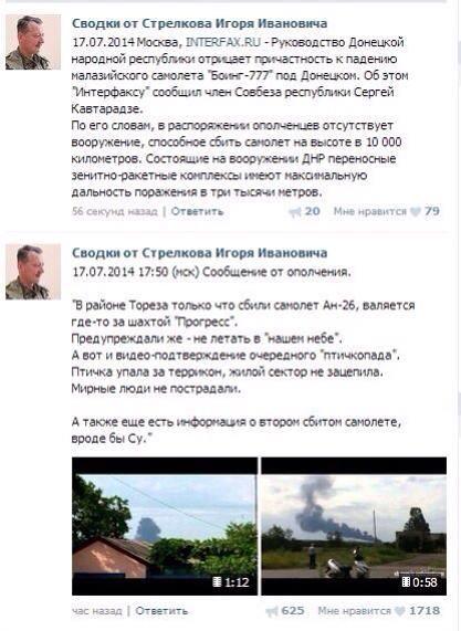 Первым этой информацией похвастался лидер боевиков Стрелков. Правда, сначала международный борт для него был ‘вроде бы Су’, но потом все быстро поменялось и героическое сообщение моментально исчезло из аккаунтов ‘ополченцев’ и появилось опровержение.