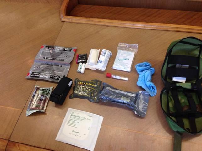 В одну такую аптечку входит: препарат сеlox rapid, израильский бандаж, cat-турникет, Пилль-бокс (мелоксикам 15 мг, левофлоксацин 500 мг, парацетамол 1000 мг), капли для глаз, согревающее одеяло, перчатки, салфетки стерильные, бинт стерильный, средства гигиены, пластырь Hyfin, салфетки при ожогах. По нынешним подсчетам для наших военных нужно еще 50 тыс таких аптечек.