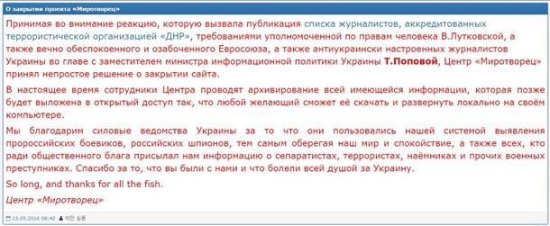 Сайт ‘Миротворец’, обнародовавший список тысяч журналистов с аккредитацией в самопровозглашенной ДНР, 13 мая объявил о своем закрытии.