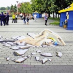 Пловец своими силой и упорством символизирует Украину, которая оставила позади осколки 20-ти нелегких прожитых лет, в которых было немало проблем и трудностей. Это символ украинских людей, не стоящих на месте, которые, как и этот спортсмен, двигаются вперед, раскрыл смысл нарисованного организатор акции Дмитрий Точка.