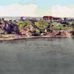 Монастырский остров, вид XIX в. Некоторые ученые предлагают считать началом зарождения города IX в., когда, по легендам, на острове построили византийский монастырь