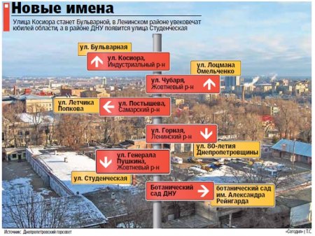 Если этот проект найдет поддержку у депутатов, то уже в 2012 году в паспортах жителей ул. Косиора в графе прописка появится новое название Бульварная (подробнее см. в таблице). Именно такое имя она носила до 1964 года. Чубаря сменит лоцман Омельченко уроженец Лоц-Каменки, вошедший в историю края, как последний лоцман знаменитых днепровых порогов. А вместо Постышева улицу назовут в честь Дважды Героя Советского Союза, почетного гражданина Днепропетровска летчика Виталия Попкова.