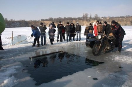 Днепропетровские дайверы создают первый в Украине речной подводный парк. На днях они пополнили его очередным экспонатом мотоциклом МТ 1979 года выпуска. Теперь по дну затопленного гранитного карьера (у села Новониколаевка) дайверы могут гулять среди пяти затопленных экспонатов здесь есть мотоцикл, кабина от КамАЗа, автоцистерна, Запорожец и Жигули.
