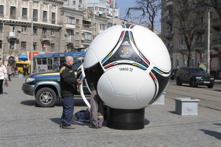 Вчера на площади возле ТРЦ ‘Пассаж’ наконец-то отремонтировали многострадальную пластиковую скульптуру мяча Евро-2012, которая на прошлой неделе дважды подверглась нападению пьяных хулиганов.