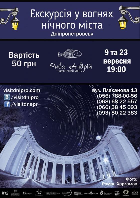 Минуле Дніпропетровська овіяне легендами та таємницями. Якщо ви хочете більше дізнатися про історію та архітектуру рідного міста запрошуємо на екскурсію У вогнях нічного міста! Ви побачите єдиний в Україні памятник кенгуру, унікальний зачарований будинок із жабами, почуєте факти та легенди, повязані з незвичними місцями Дніпропетровська.