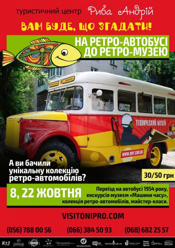 У Дніпропетровську є дивовижне місце, у якому кожен бажаючий зможе здійснити подорож у часі. Запрошуємо Вас на екскурсію до музею ретро-автомобілів! Ви проїдетесь на унікальному автобусі 1954 року та опинитесь у нашому місті середини минулого століття: прогуляєтесь по вулиці 1960-1970-х рр., відпочинете на радянській лавочці поруч із автоматом газводи, зазирнете у вітрини різноманітних магазинчиків. А також, Ви побачите колекцію легкових, вантажних, спортивних автомобілів радянських часів, ретро-техніку та ще багато цікавих експонатів.