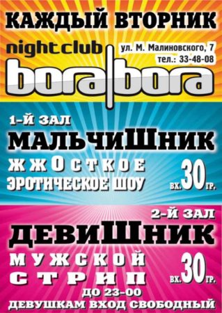Афіша Каждый вторник, Вечеринка МальчиШник + ДевиШник”” By Татьяна Иванова - 25.07.2011 00:00 0 21 Поділитися FacebookViberTelegramTwitterWhatsAppPinterestPrintEmail Каждый вторник, Вечеринка ‘МальчиШник + ДевиШник’ Шоу в двух залах Бора-Бора (Bora Bora) Адрес: ул. Малиновского, 7, тел.: 33-48-08Время: 21:00 Цена билета: 30 грн., до 23:00 – девушкам вход свободный + подарок – коктейль