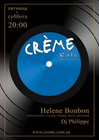 Афіша Каждую пятницу, Helene Bonbon. Dj Philippe, Крем (Creme) By Татьяна Иванова - 17.01.2011 00:00 0 9 Поділитися FacebookViberTelegramTwitterWhatsAppPinterestPrintEmail Каждую пятницу, Helene Bonbon. Dj Philippe, Крем (Creme) Живой вокал в стиле lounge, disco, euro-pop Крем (Creme) Адрес: ул. Дзержинского, 37-Б, Тел.: 373-70-79, (067) 622-08-77Время: 20:00Цена билета: бронируйте столики заранее