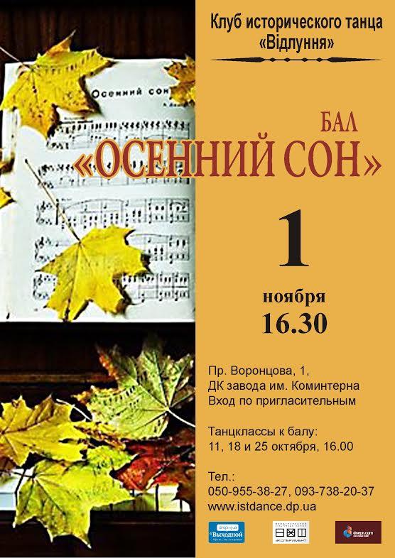 Клуб исторического танца ‘Відлуння’ предлагает на время отвлечься от всех проблем и погрузиться в ‘Осенний сон’ легкую и воздушную атмосферу бала начала ХХ века, в которой соединяется галантность и учтивость века XIX-го со стремительностью и свободой века нового.