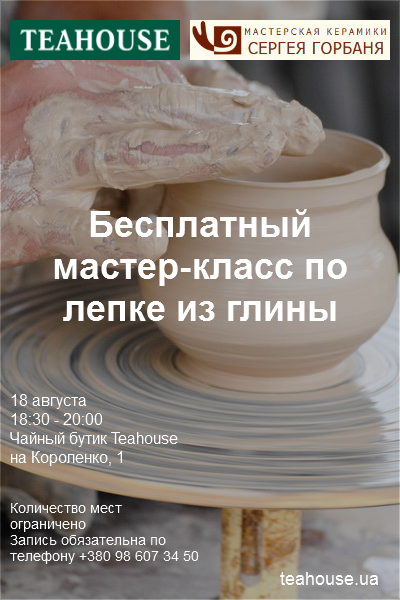 Приятная атмосфера чайного бутика Teahouse, мягкий стук гончарного круга, опытные руки великого мастера гончарного дела Сергея Горбаня и его прелестных помощниц, податливая глина, твоя фантазия и вуаля ты создал шедевр! Тарелки, чашки, вазы, блюдца и блюда ты можешь создать все что угодно!