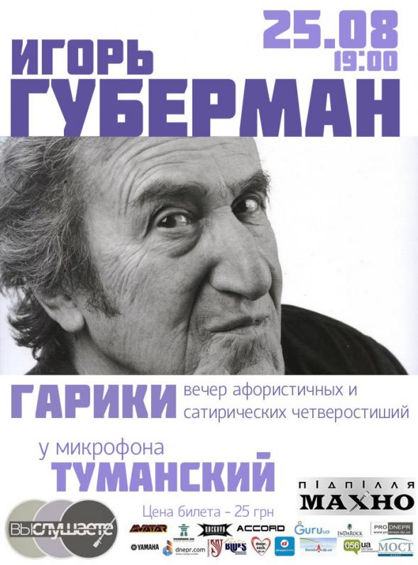 Урожденный харьковчанин Игорь Губерман – одна из ярчайших звёзд отечественной сатиры, уложенной в компактные четверостишия, называемые Гариками. На вечере зрители услышат одни из самых остроумных, пророческих или смешных произведений Игоря Мироновича из циклов ‘Гарики на каждый день’, ‘Камерные гарики’, ‘Иерусалимские гарики’ и’Закатные гарики’