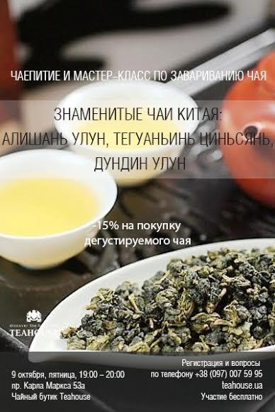 В пятницу, 9 октября, в чайном бутике Teahouse на Карла Маркса 53а вы сможете не только отведать самые вкусные и самые известные элитные полуферментированные чаи (или улуны) Китая, но и узнать секреты правильного заваривания этих видов чая в домашних условиях.