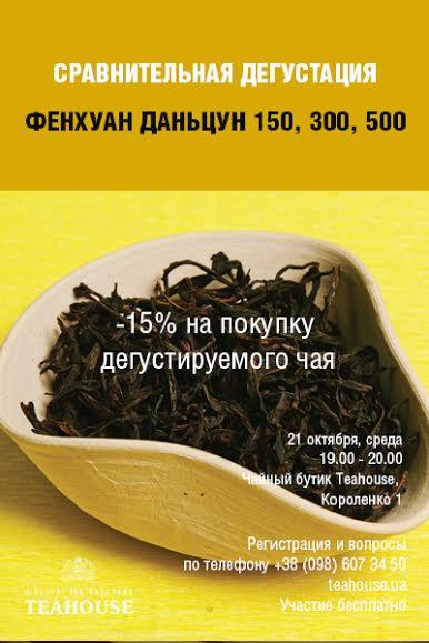 В среду, 21 октября, в чайном бутике Teahouse на Короленко 1 будем учиться тонкостям сравнительной дегустации на примере легендарного, редкого, элитного китайского улуна Фенхуан Даньцун.