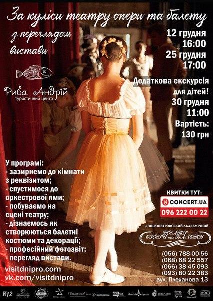 Кажуть, що театр починається з вішалки. Але насправді він починається по той бік куліс там, де народжуються вистави. Ми пропонуємо вам унікальну можливість зазирнути за лаштунки Дніпропетровського Академічного Театру Опери та Балету і побачити те, чого зазвичай не бачать глядачі. У ході екскурсії ви зможете зазирнути до кімнати з реквізитом, дізнатись як гримери перетворюють артистів на казкових персонажів, та втілити різні образи під час імпровізованої фотосесії. Спустимося до оркестрової ями. Крім того, ви дізнаєтесь, як створюються балетні костюми та декорації для постановок, а також побуваєте на сцені театру, де на власні очі побачите останні приготування перед виставою! По завершенню екскурсії ми відвідаємо виставу.