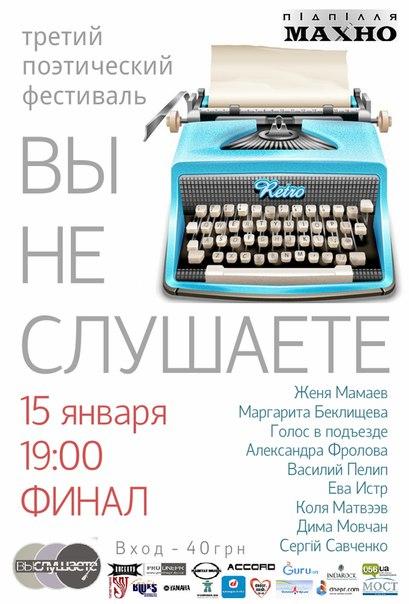 Ну, вот и подходит к финалу третий поэтический фестиваль ‘Вы не слушаете’. За главный приз будут бороться: Женя Мамаев, Маргарита Беклищева, Голос в подъезде, Александра Фролова, Василий Пелип, Ева Истр, Коля Матвєєв, Дима Мовчан и Сергій Савченко.