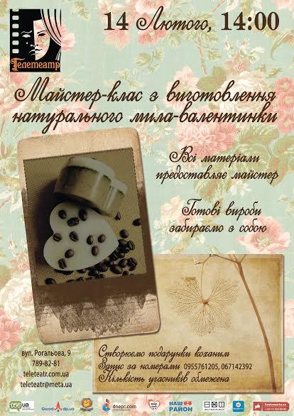 Запрошуємо на майстер-клас з виготовлення натурального мила-валентинки. Майстер клас проводить Олена Ястребова, вироби майстрині мають тільки найкраші відгуки не тільки в Україні, а й в інших країнах. Всі матеріали надає майстер, все, що зробимо, забираємо з собою. Основа для мила, олії та ароматизатори сертифіковані.