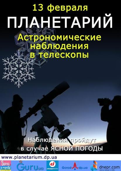 13 февраля 2016 года, вечером, с наступлением темноты Днепропетровский планетарий проведёт астрономические наблюдения на своей площадке перед