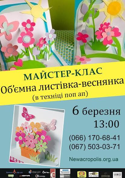 Напередодні 8 березня художня студія Кайрос запрошує зробити подарункову листівку власноруч. На майстер-класі ви освоїте техніку обємної листівки, виготовлену зі щільного картону. Незважаючи на складну конструкцію, її виготовляти досить просто. Ви зможете прикрасити листівку тематичними малюнками та аплікаціями і подарувати її рідним чи друзям до свята.