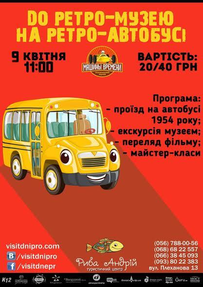 У Дніпропетровську є дивовижне місце, у якому кожен бажаючий зможе здійснити подорож у часі. Запрошуємо Вас на екскурсію до музею ретро-автомобілів! Ви проїдетесь на унікальному автобусі 1954 року та опинитесь у нашому місті середини минулого століття: прогуляєтесь по вулиці 1960-1970-х рр., відпочинете на радянській лавочці поруч із автоматом газводи, зазирнете у вітрини різноманітних магазинчиків. А також, Ви побачите колекцію легкових, вантажних, спортивних автомобілів радянських часів, ретро-техніку та ще багато цікавих експонатів.