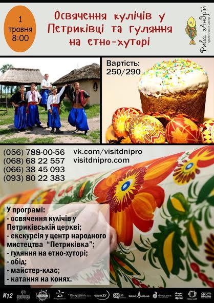 Запрошуємо Вас зустріти головне християнське свято разом з нами! За традицією, на Великдень прийнято йти до храму та освячувати кулічі. Саме з цією метою ми відвідаємо церкву … у Петриківці. Ознайомимось з експозицією у центрі народного мистецтва Петриківка. І завітаємо до етно-хутора ‘Козацька січ’. За кілометр до хутора нас зустрінуть козаки на конях, на подвір’ї господарі привітають хлібом-сіллю, а також познайомлять з українськими народними традиціями й побутом селян і козаків. Тут все справжнє – і відновлені хати-мазанки, і домашнє начиння, і селянські знаряддя праці, і бойова зброя. Також на нас чекає майстер клас з Петриківського розпису, катання на конях, українські страви, забави.