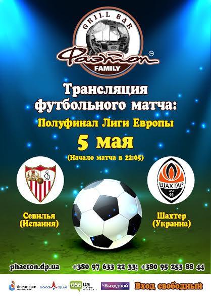 Сразу после выступления нашей Гостьи сцены, Марии Руты, традиционно, за вкусным столом с бокалами в руках фирменного пива Фаэтон и не только, мы посмотрим матч Севилья (Испания) – Шахтер, начало в 22:05. Увлекающая и ужесточенная борьба команд подходящих уже все ближе и ближе к финалу обещает быть очень интересной! Болейте за футбол вместе с гриль-баром Фаэтон! Поддержим наших!