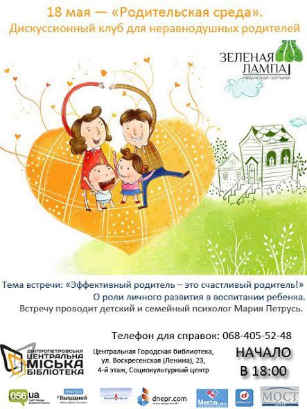 Клуб собирается каждую третью среду месяца. Первая встреча: Эффективный родитель это счастливый родитель. О роли личного развития в воспитании ребенка.