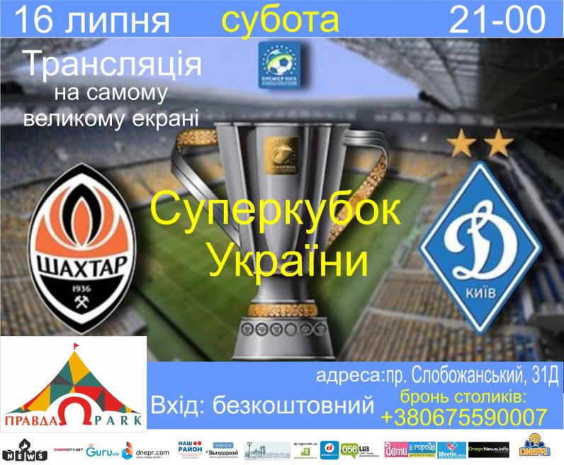 Події (Заходи) Трансляция Супер кубок Украины”” By Татьяна Иванова - 15.07.2016 00:00 0 19 Поділитися FacebookViberTelegramTwitterWhatsAppPinterestPrintEmail 16 июля Поединок за Супер кубок Украины между ‘Динамо’ и ‘Шахтером’ с 21.00. Вход: свободный Заказ столов 0675590007 ПРАВДА Парк возле ТЦ ‘Наша Правда’ пр.Слобожанский 31Д Dnepr.com