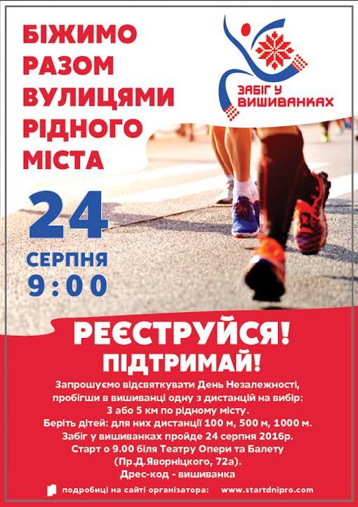 Забіг у вишиванках пройде 24 серпня 2016 р. Старт о 9:00 біля Театру Опери та Балету (пр. Д. Яворницького, 72 а).