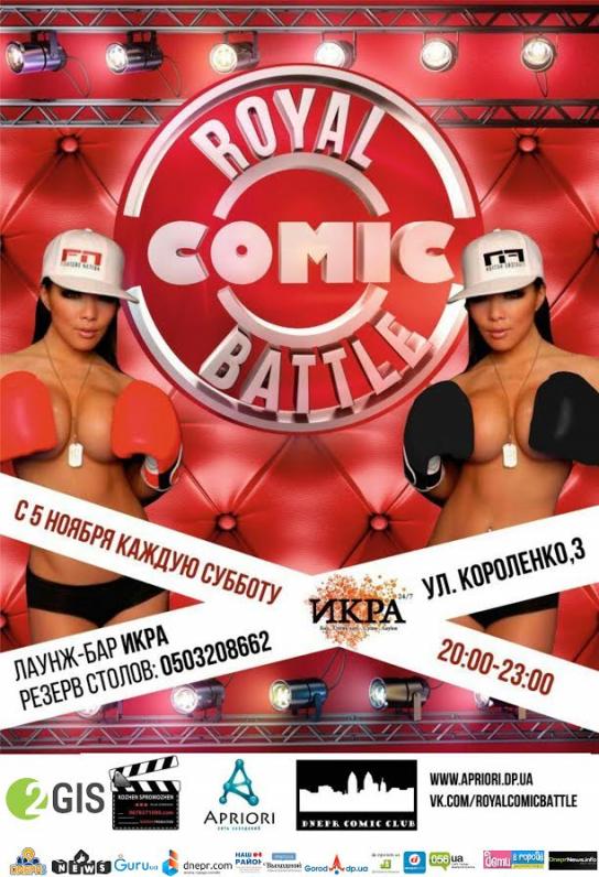 Друзья! Dnepr Comic Club совместно с Киностудией KozhenSpromozhen Film Company объявляют о проведении Первого всеукраинского чемпионата юмора Без цензуры Royal Comic Battle, призовой фонд которого составляет 40 000 грн.