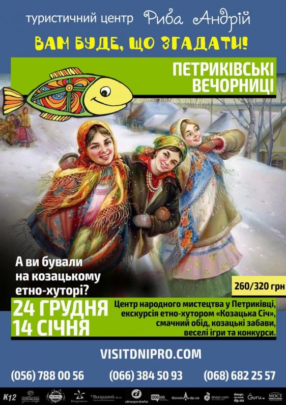Як козаки Новий Рік відзначали? Напередодні новорічних свят туристичний центр Риба Андрій їде до Петриківки, щоб знайти відповідь на це питання! На вас чекають українські вечорниці на етно-хуторі Козацька Січ, веселі конкурси від козаків для дітей і дорослих, а також смачний український обід! І, звичайно ж, прекрасний відпочинок і чудовий настрій! За кілометр від хутора нас зустрінуть козаки на конях, у дворі господарі зустрінуть з хлібом-сіллю, познайомлять з українськими народними традиціями. Дід Мороз і Снігуронька, виступ народного ансамблю, різноманітні ігри та конкурси та навіть … дискотека! Це тільки невелика частина того, що буде відбуватися на етно-хуторі 24 грудня.
