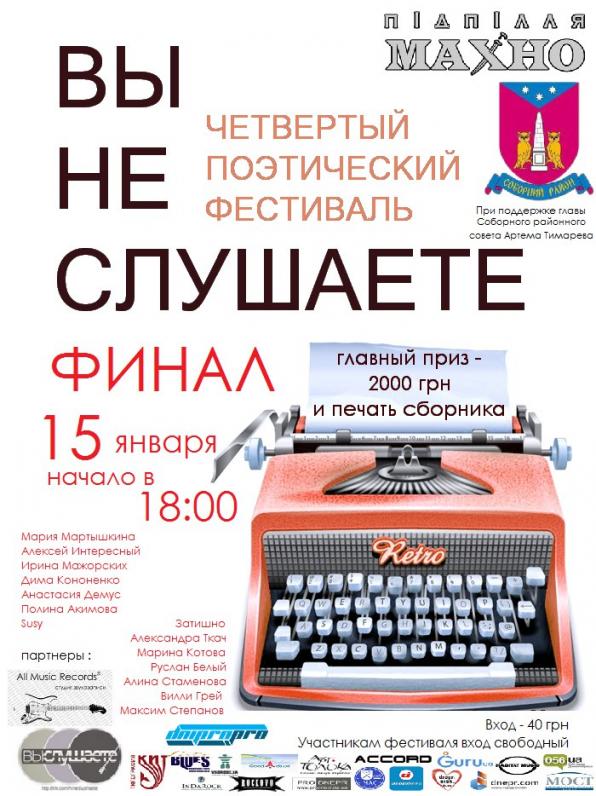 Итак, уже совсем скоро, 15.01.2017, в 18:00, на том же месте, произойдёт масштабный финал четвертого поэтического фестиваля ‘Вы не слушаете’, в рамках которого между собой будут определять лучшего автора 14 (четырнадцать) претендентов!