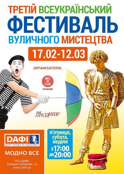 III Всеукраинский фестиваль уличного искусства возвращается в Днепр с непривычными для зимы артистами: мимами, живыми статуями, фокусниками и представителями других жанров уличного искусства. С 17 февраля по 12 марта по вечерам каждой пятницы субботы и воскресенья артисты будут развлекать гостей, а жюри, состоящее из авторитетных представителей артистической профессии, – оценивать мастерство конкурсантов. чтобы разделить в последний день Фестиваля призовой фонд в 80 000 грн.