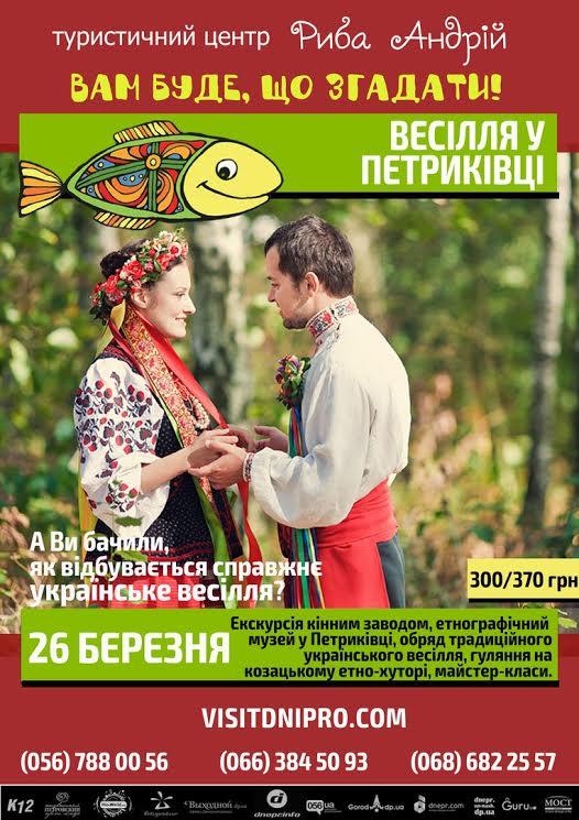 А ще, ми побуваємо в Петриківському етнографічному музеї. Після екскурсії та знайомства з історією розвитку Петриківки на вас чекає найсправжнісіньке українське весілля! Які традиції і обряди супроводжували це свято в минулих століттях? Як виглядала весільний одяг наших бабусь і дідусів? У незвичайному музеї весілля ви не тільки почуєте захоплюючу розповідь, але й випробуєте все на собі!