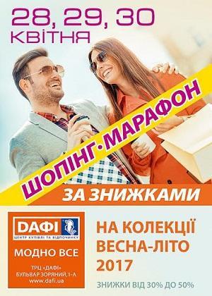 Итак, 28, 29, 30 апреля время Большого Шопинга: трехдневный марафон по магазинам ТРЦ Дафи. В привычное дневное время, без суеты и без толп народу. Зато со скидками до 50% на новые весеннее-летние коллеции одежды, обуви и аксессуаров сезона 2017-го года.