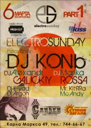 Події (Заходи) 6 марта, ELECTRO SUNDAY @ Сливки By Татьяна Иванова - 26.02.2011 00:00 0 21 Поділитися FacebookViberTelegramTwitterWhatsAppPinterestPrintEmail 6 марта, ELECTRO SUNDAY @ Сливки headliner Dj Конь Dj Alexandr Galickit Сливки Начало: 22:00 Адрес: просп. Карла Маркса, 49, Центр (ЦУМ) Тел.: (050) 340-27-04, заказ столиков 744-66-67