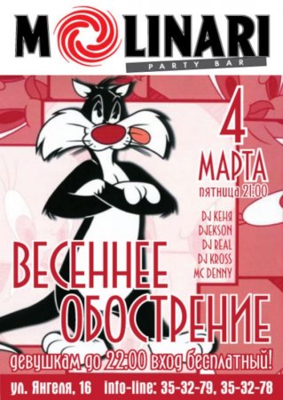 Події (Заходи) 4 марта, Весеннее обострение, Молинари (Molinari) By Татьяна Иванова - 26.02.2011 00:00 0 11 Поділитися FacebookViberTelegramTwitterWhatsAppPinterestPrintEmail 4 марта, Весеннее обострение, Молинари (Molinari) Dj KеняDj EksonDj RealDj KrossMC Denny Молинари (Molinari) Начало: 21:00 Адрес: ул. Янгеля, 16, Кирова пр. – Рабочая Тел.: 35-32-79, 35-32-78