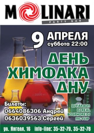 Події (Заходи) 9 апреля, День химфака ДНУ, Молинари (Molinari) By Татьяна Иванова - 04.04.2011 00:00 0 24 Поділитися FacebookViberTelegramTwitterWhatsAppPinterestPrintEmail 9 апреля, День химфака ДНУ, Молинари (Molinari) Dj FaraonDj RealBosphore DjMc Flip Молинари (Molinari) Начало :22:00 Адрес: ул. Янгеля, 16, Кирова пр. – Рабочая Тел.: 35-32-79, 35-32-78