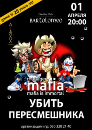 1 апреля 2011, 20:00 Manager of Mafia – Убить пересмешника Салонная ролевая игра Менеджер Мафии – игра ‘Убить пересмешника’ Время: 20:00 Место проведения – Сreative Club Bartolomeo Информация: организация игр: 050-320-21-40 clublrp@gmail.com