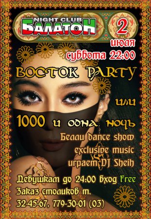 Цена билета: Девушкам до 24:00 вход свободный. Звоните и заказывайте столик т.779-30-01(03), 32-45-67.
