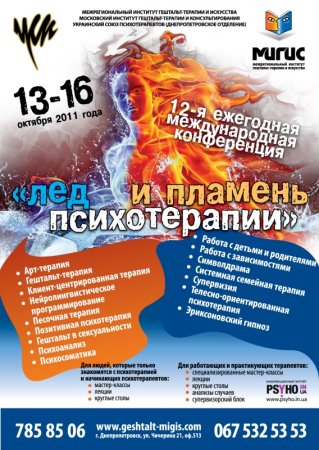 13-16 октября состоится 12-я ежегодная международная конференция МИГИС Лед и пламень психотерапии. Мастер-классы, круглые столы, обсуждение случаев, лекции от ведущих психотерапевтов Межрегионального института гештальт-терапии, Московского института гештальт-терапии и консультирования, Украинского союза психотерапевтов. Направления работы: арт, гештальт, клиент-центрированная, песочная, позитивная, телесно-ориентированная, семейная психотерапии, работа с детьми и родителями, зависимостями, символдрама и много-многое другое! Присоединяйтесь!
