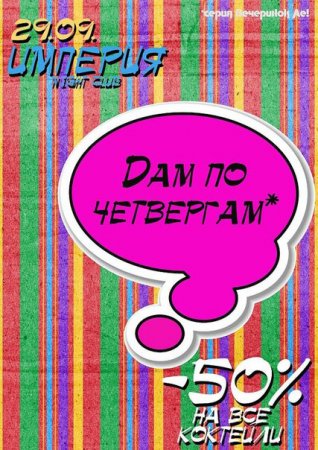 Події (Заходи) 29 сентября, Daм по четвергам, Империя By Татьяна Иванова - 12.09.2011 00:00 0 18 Поділитися FacebookViberTelegramTwitterWhatsAppPinterestPrintEmail 29 сентября, Daм по четвергам, Империя – 50% на все коктейли Империя, ночной клуб Адрес: ул. Набережная Победы, 38, Победа – Сокол Тел.: 097 500 99 00,093 000 2 777 Время: 22:00Цена билета: уточняйте дополнительно