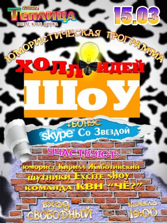Дамы и господа! Любителям по-бугагировать от души, зарядиться юмористической энергетикой, отведать шедевры европейской кухни а также пообщаться со звездами в скайпе, – приглашаем Вас посетить наше ‘Холлидей шоу’ в кафе ‘Теплица’!