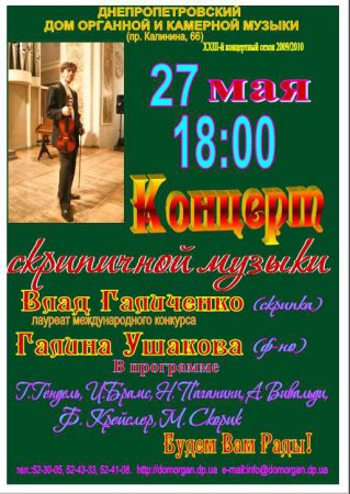 Концерт скрипичной музыки. Л.м.к. Влад Галиченко, Галина Ушакова. Г.Гендель, И.Брамс, Н.Паганини, А.Вивальди, Ф. Крейслер, М.Скорик.