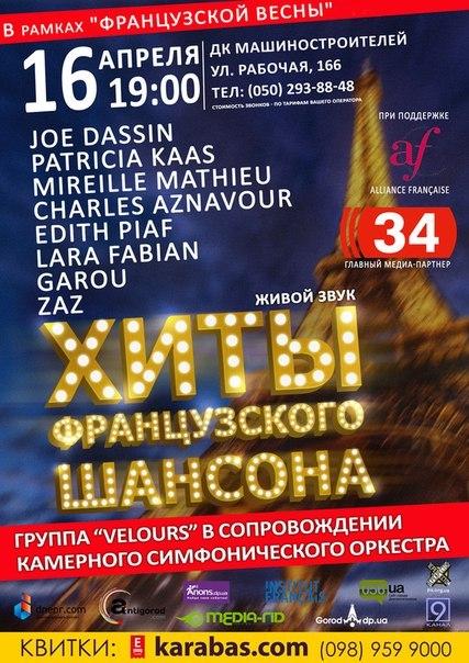 ХИТЫ ФРАНЦУЗСКОГО ШАНСОНА в исполнении группы ‘Velours’ и камерного симфонического оркестра в рамках ‘Французской весны’ в Украине! При поддержке Alliance Fran&ccedil,aise!