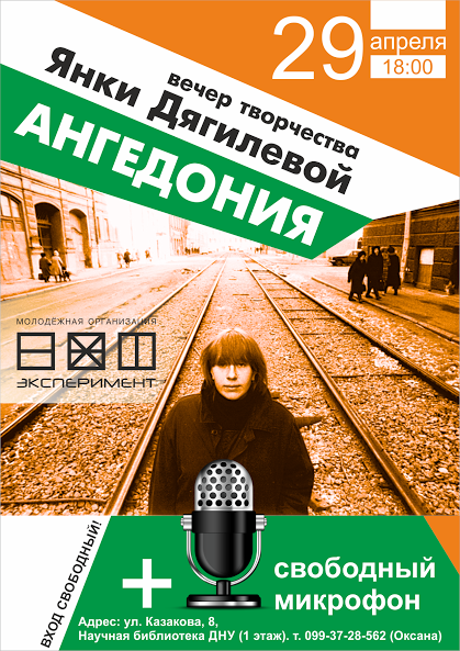 Второй частью мероприятия будет Свободный Микрофон! Так что если вы не исполняете песни Дягилевой, но очень хотите выступить готовьте свои или чужие (горячо любимые и почитаемые) стихи, песни, мелодии, приходите на вечер в молодежный творческий клуб Штрих и делитесь ими!