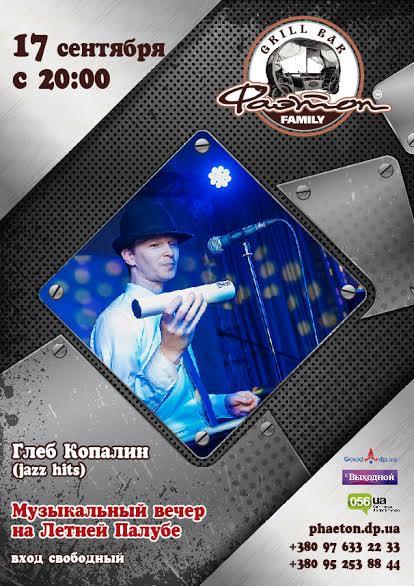 Яркий и насыщенный четверг, 17 сентября, ждет наших Гостей! Гриль-бар Фаэтон с открытыми вратами приглашает Вас на вечер артистичного и выразительного классического джаза в исполнении Глеба Копалина на сцене Летней Палубы Фаэтона. Будет очень интересно!