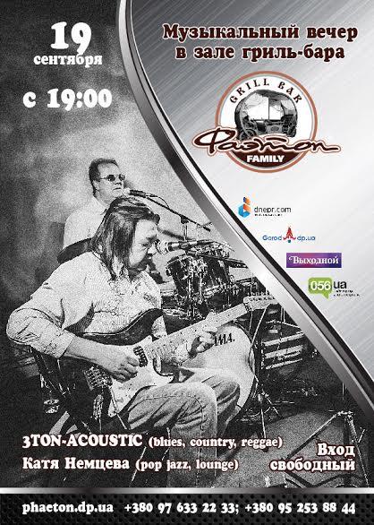 В субботу, 19 сентября, Вы услышите знакомые мотивы известных хитов в исполнении гостей на сцене Фаэтона! Яркая, заводая и харизматичная группа 3ton-acoustic угостит Вас, как всегда вкусными музыкальными бестселлерами. Приглашаем Вас провести незабываемый, теплый, почти домашний вечер в уютной обстановке вместе с гриль-баром Фаэтон.